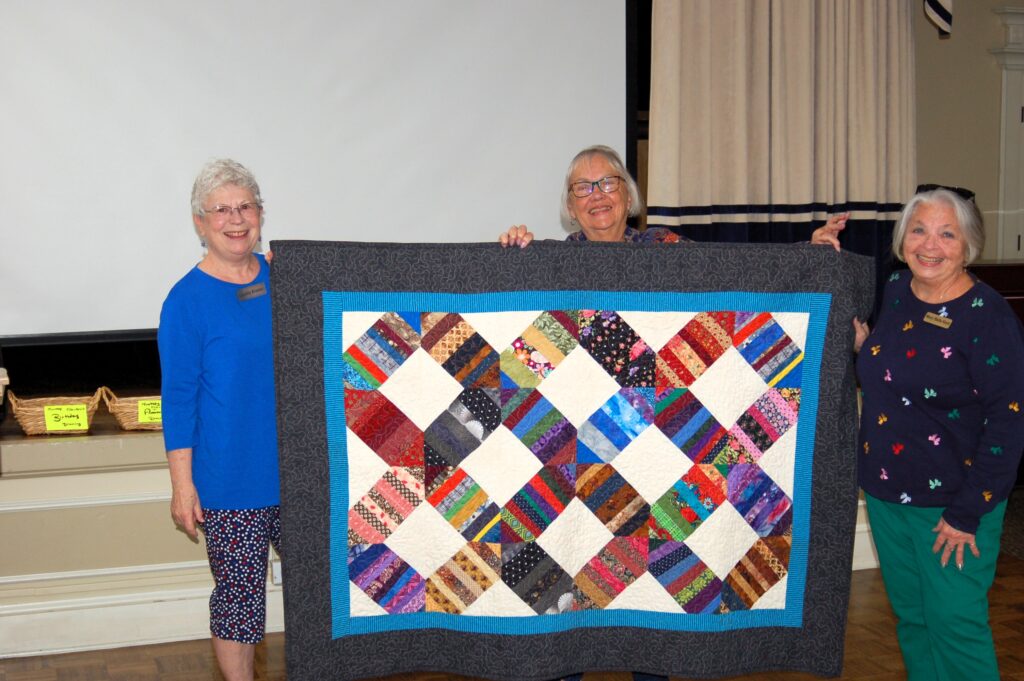 Loretta Kramer and Kathy Blaskovich award the Raffel Quilt to Mary Belle Kent. $200 was raised in this effort by