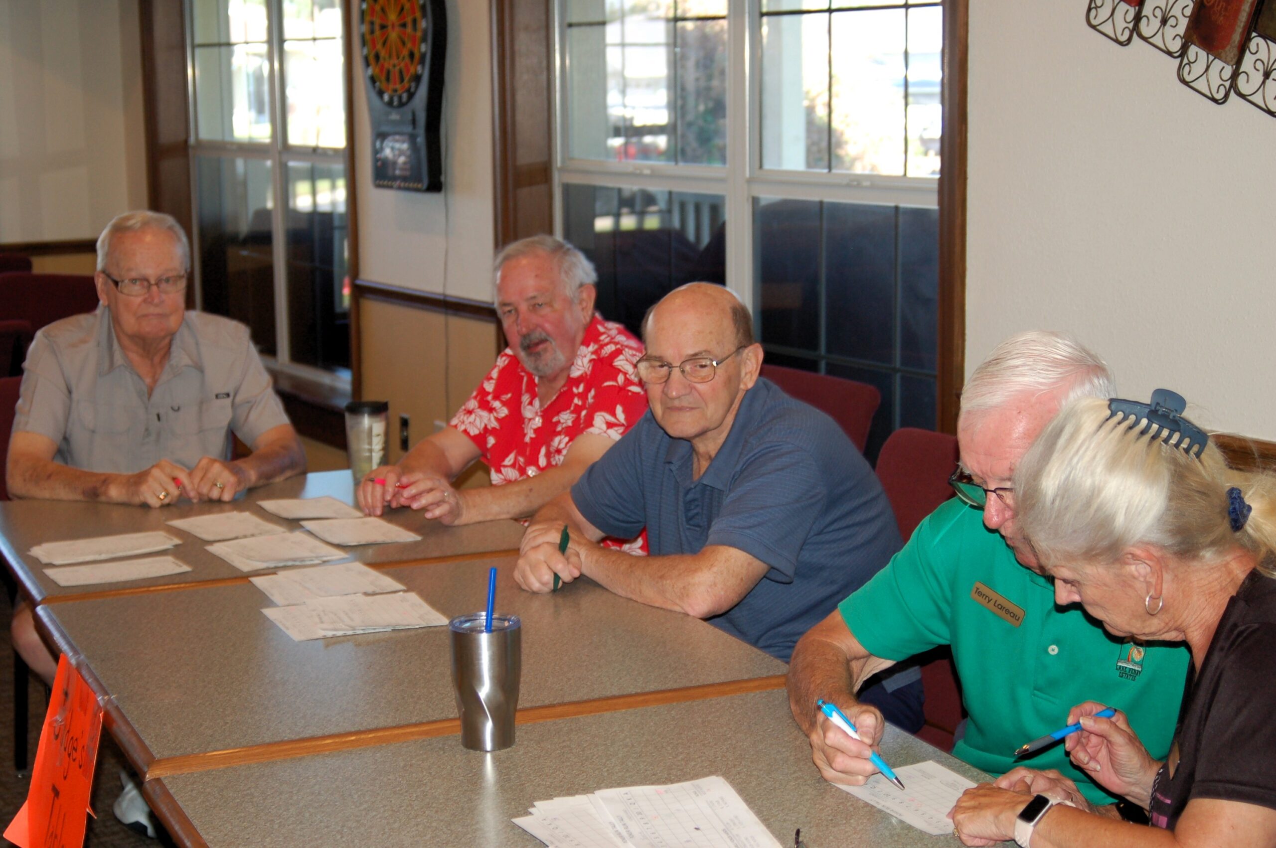 All five judges examine the cards: David Wilde, Bob Reuwer, Rocco Guarino, Terry Lareau, and Pam Lottinville.